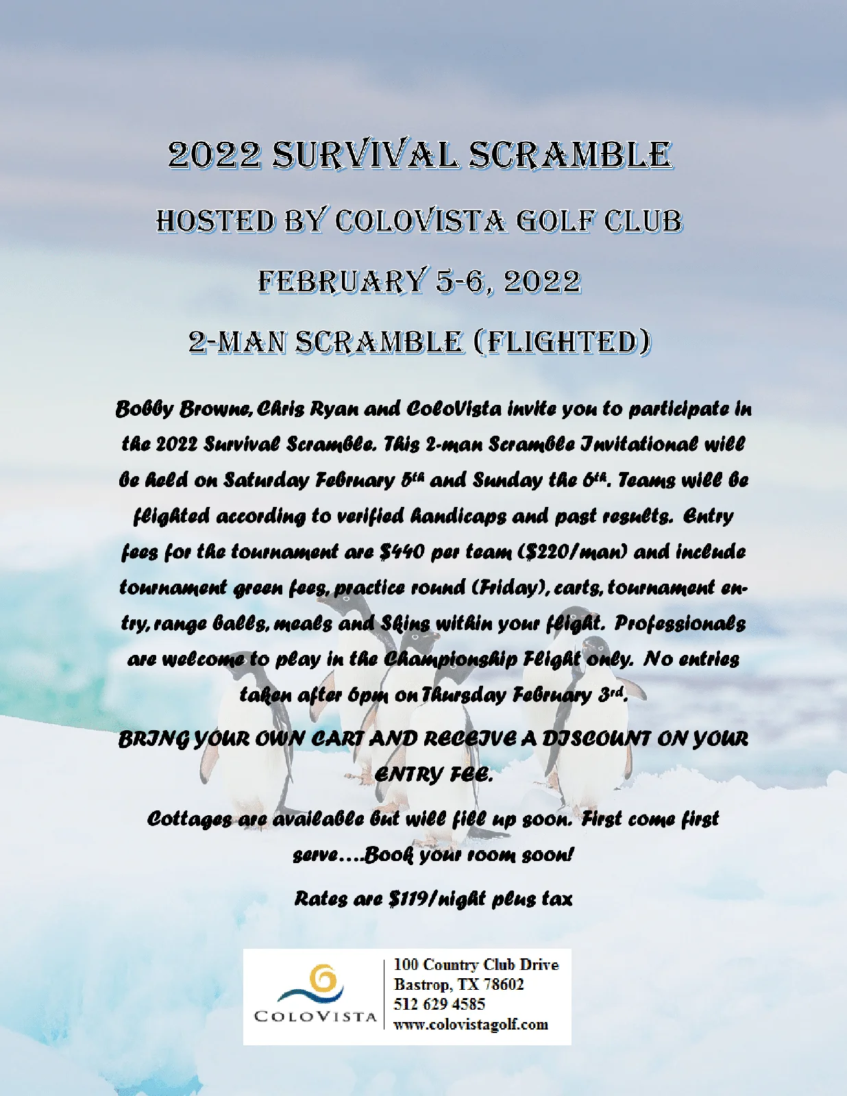 2022 Survival Scramble + Add to Google Calendar + iCal / Outlook export Date Feb 05 - 06 2022 Expired! Location ColoVista Golf Club ColoVista Golf Club, Bastrop, TX Category Tournament Share this event